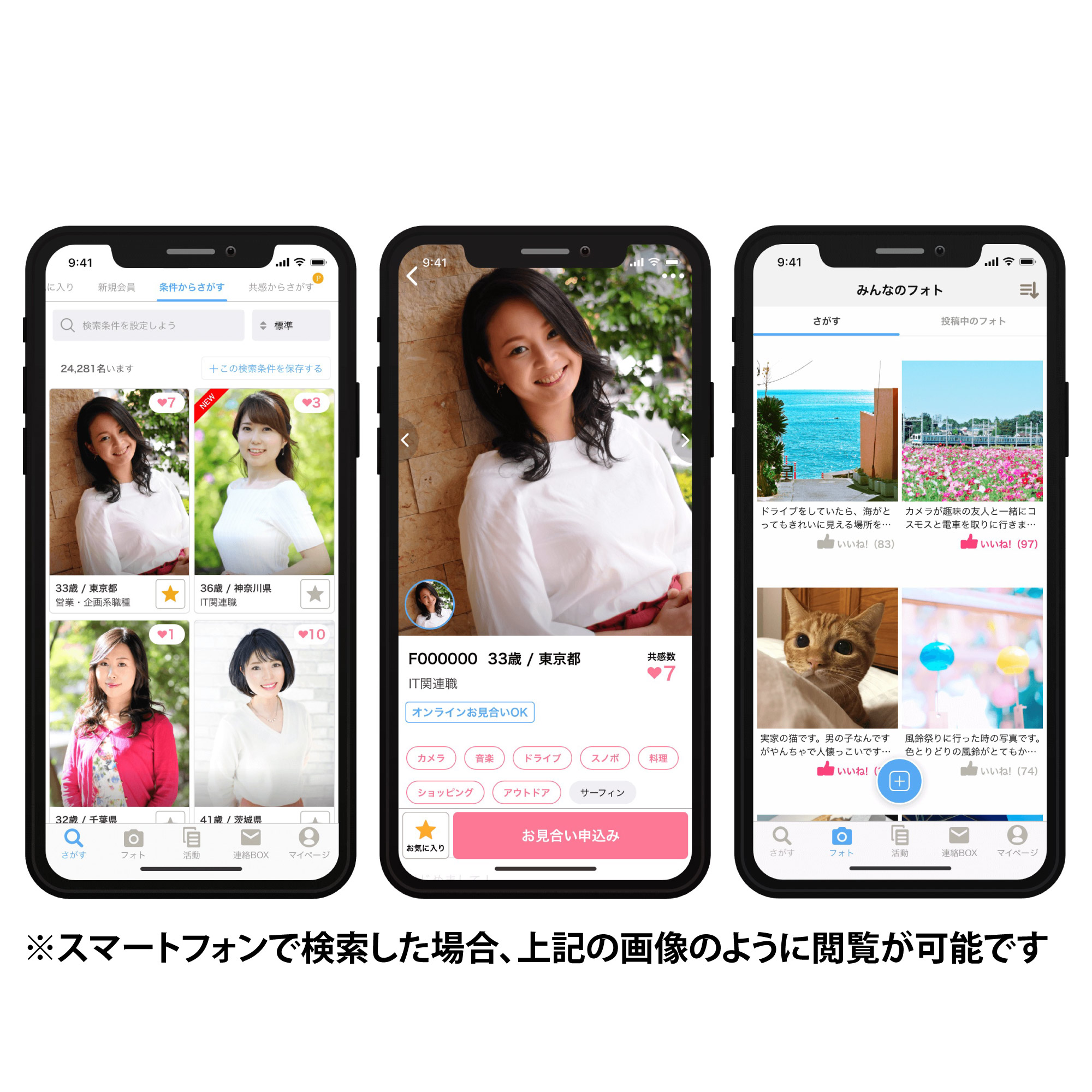 ご自宅のパソコン・スマホから24時間いつでも自由にお相手を探すことができます。